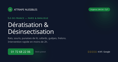 Attrape Nuisibles intervient à Paris pour tous vos besoins en dératisation, désinsectisation, destruction de nids de guêpes et frelons et traitement des punaises de lit. Nous éliminons efficacement les nuisibles et garantissons des résultats durables pour votre bien-être.