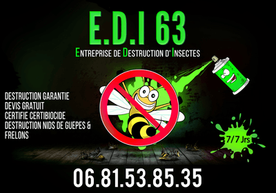 E.D.I. 63 déclare intervenir notamment sur : Dératisation (rats, souris), Guêpes frelons. Les besoins réels (espèce, surface, urgence) sont précisés lors de votre demande sur Nuigo pour orienter vers le bon protocole.